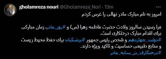 کشاورزی- رمزگشانیوز؛ غلامرضا نوری قزلجه امروز جمعه در حساب کاربری خود در شبکه ایکس نوشت: فرارسیدن سالروز ولادت حضرت فاطمه زهرا(س) و روز مادر زمان مبارکی برای درختکاری است.