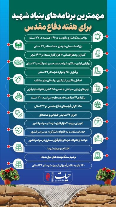 همچنین برپایی اردوهای زیارتی سیاحتی با حضور ۴۴ هزار و ۵۰۰ نفر از خانوادههای ایثارگران، برگزاری ۱۴ هزار میز خدمت طرح سپاس، نمایش ۴۲ اجرای خیابانی و صحنهای و اکران ۱۲۸ فیلم دفاع مقدس در استانها در دستورکار قرار دارد.