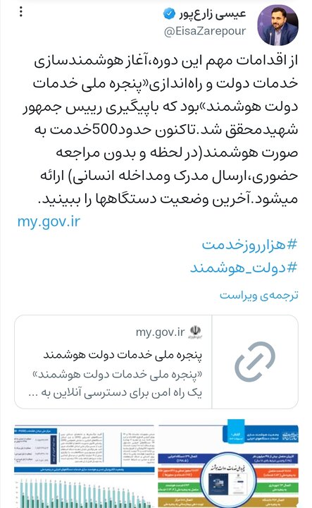 فناوری- رمزگشانیوز؛ عیسی زارع پور وزیر ارتباطات و فناوری اطلاعات در شبکه اجتماعی ویراستی در خصوص هوشمندسازی خدمات دولت گفت: از اقدامات مهم این دوره، آغاز هوشمندسازی خدمات دولت و راهاندازی «پنجره ملی خدمات دولت هوشمند» بود که با پیگیری رئیس جمهور شهید محقق شد.