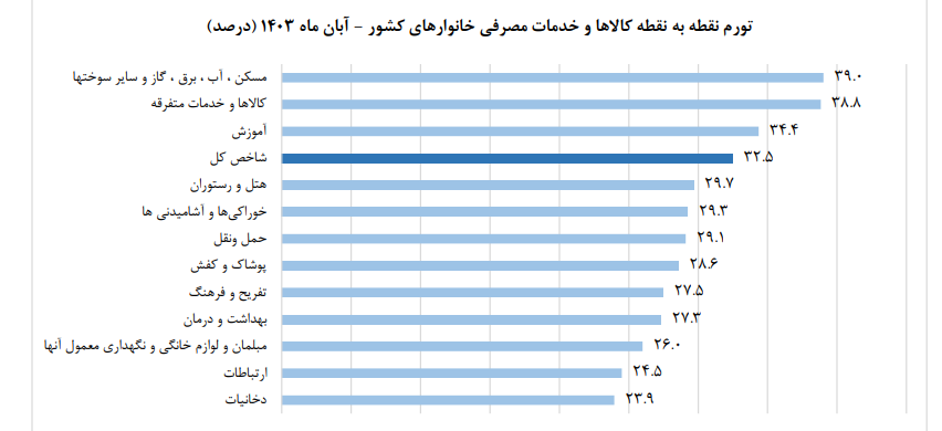 در آبان ماه ۱۴۰۳ شاخص قیمت مصرف کننده خانوارهای کشور به عدد ۲۷۹.۵ رسیده است که نسبت به ماه قبل، ۲.۸ درصد افزایش، نسبت به ماه مشابه سال قبل، ۳۲.۵ درصد افزایش و در دوازده ماهه منتهی به ماه جاری نسبت به دوره مشابه سال قبل، ۳۳.۱ درصد افزایش داشته است.