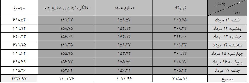 جمعه ۱۷ مرداد: نیروگاهها در آخرین روز هفته ۳۰۵ میلیون و ۴۳۰ هزار مترمکعب، صنایع عمده ۱۵۶ میلیون و ۲۱۰ هزار مترمکعب و بخش خانگی، تجاری و صنایع جزء ۱۵۳ میلیون و ۶۲۰ هزار مترمکعب گاز مصرف کردند. مجموع مصرف سه بخش در این روز به ۶۱۵ میلیون و ۲۶۰ هزار مترمکعب رسید.