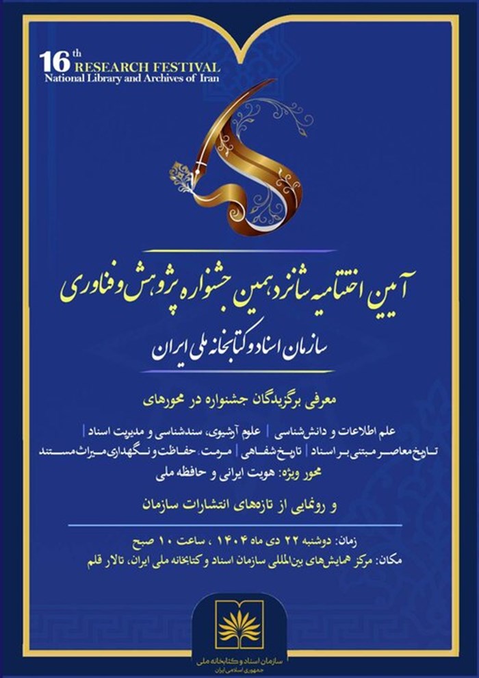 فرهنگ و هنر- رمزگشانیوز؛ روابط عمومی سازمان اسناد و کتابخانه ملی اعلام کرد: این سازمان به فعالیت و ارائه خدمات خود ادامه میدهد و همچنین اختتامیه شانزدهمین جشنواره پژوهش و فناوری این سازمان با محوریت «هویت ایرانی و حافظه ملی»، روز دوشنبه ۲۲ دیماه ۱۴۰۴، ساعت ۱۰ صبح، در مرکز همایشهای بینالمللی سازمان اسناد و کتابخانه ملی ایران، تالار قلم، با حضور سیدرضا صالحیامیری وزیر میراث فرهنگی، گردشگری و صنایع دستی برگزار میشود.