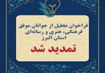 با استقبال گسترده جوانان البرزی از نخستین دوره فراخوان تجلیل از جوانان موفق فرهنگی، هنری و رسانهای، زمان ارسال آثار و مدارک شرکتکنندگان تا 15 دیماه تمدید شد.